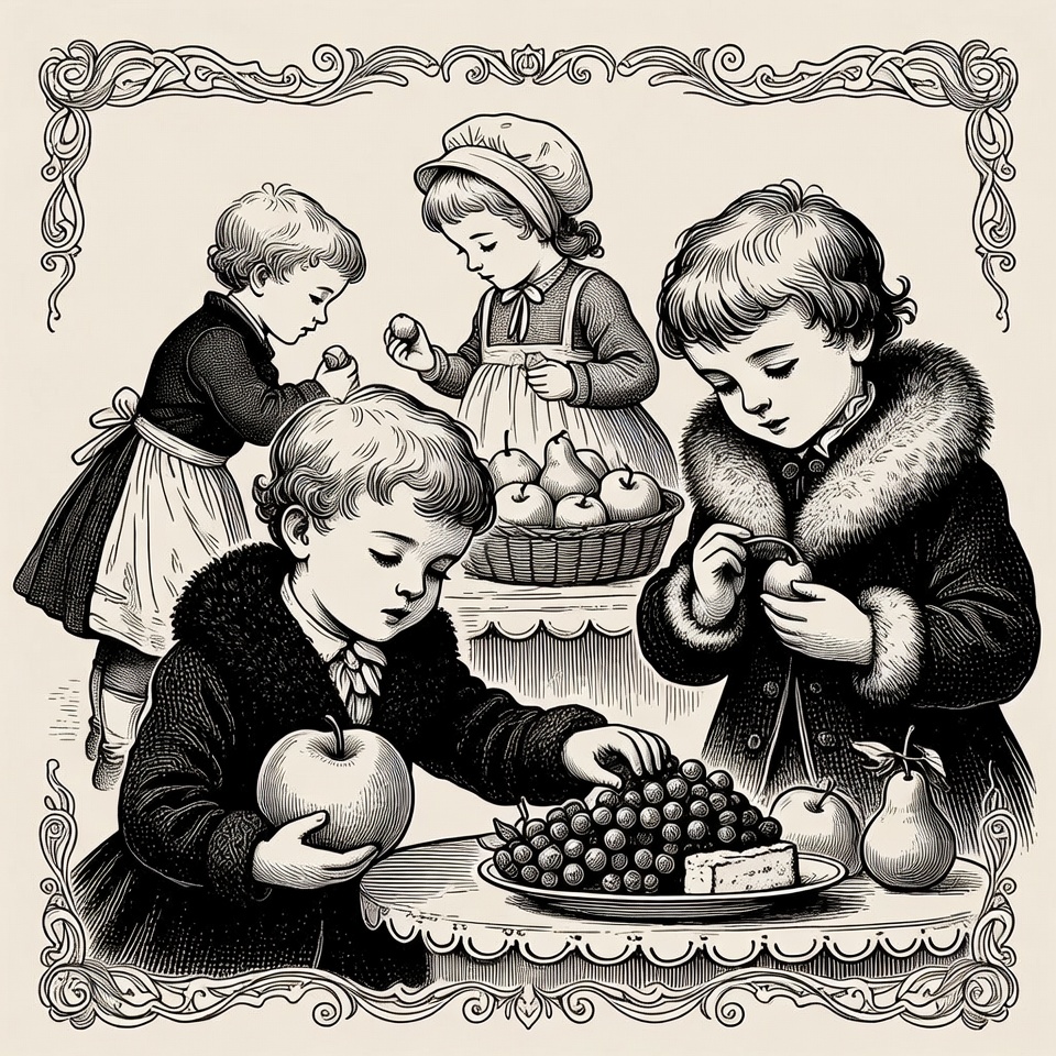 Vintage illustration shows four young children gathered around a table with fruits. Two girls in aprons and bonnets and two boys in fur-trimmed coats hold apples, grapes, pears, and cheese. They examine the produce closely on a decorative table with an ornate frame.