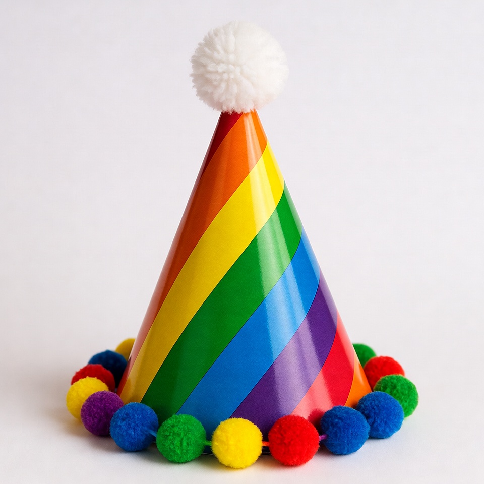 birthday hat, celebration, colorful hat, cone hat, festive, isolated background, multicolored pom poms, party hat, pom poms, rainbow stripes, red orange yellow green blue purple, vibrant colors, white pom pom, rainbow hat