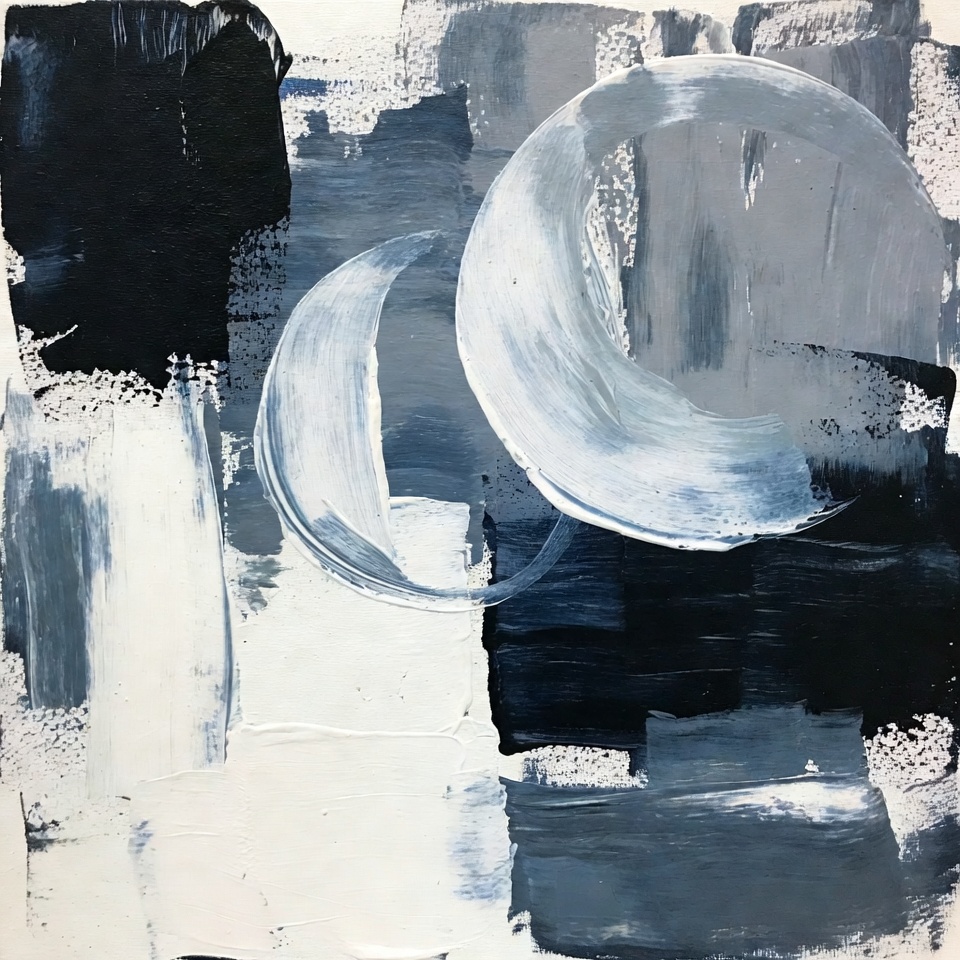 abstract painting, artistic, black, brushstrokes, canvas, circles, dark background, expressionism, gray, grayscale, light accents, minimalist, modern art, moon, painting, round forms, shapes, textured, white, abstract art