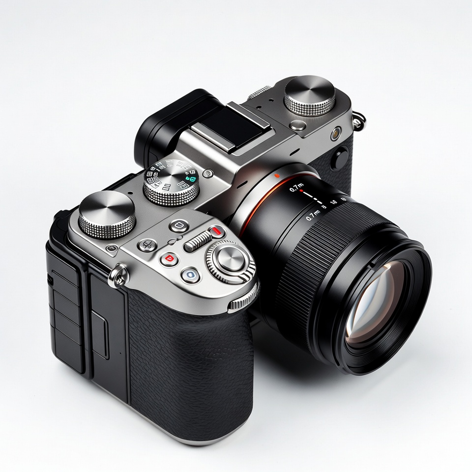 Alpha camera, black camera, camera body, camera buttons, camera grip, control dials, digital camera, isolated background, mirrorless camera, photography gear, professional camera, silver camera, telephoto lens, zoom lens, Sony camera