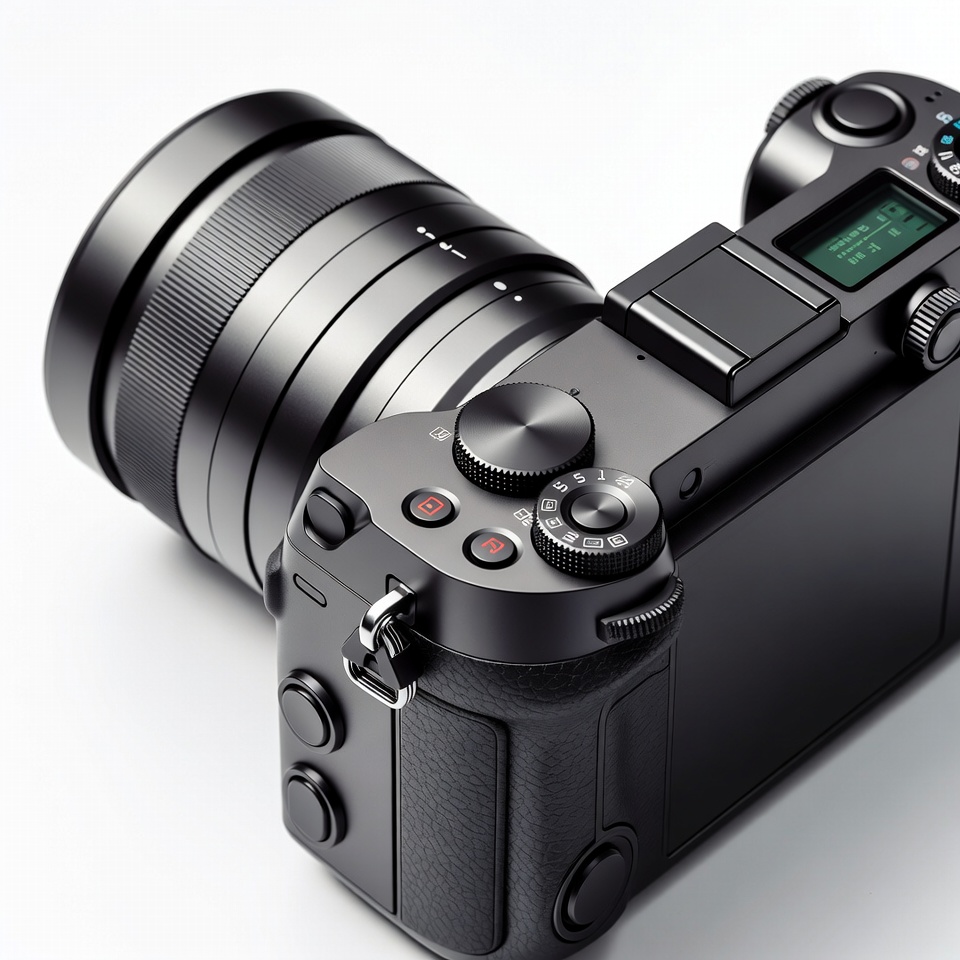 A sleek black mirrorless camera with a large attached lens is displayed from a side angle. The camera features detailed buttons, dials, a textured grip, and a green LCD screen on top. It is positioned against a plain white background.