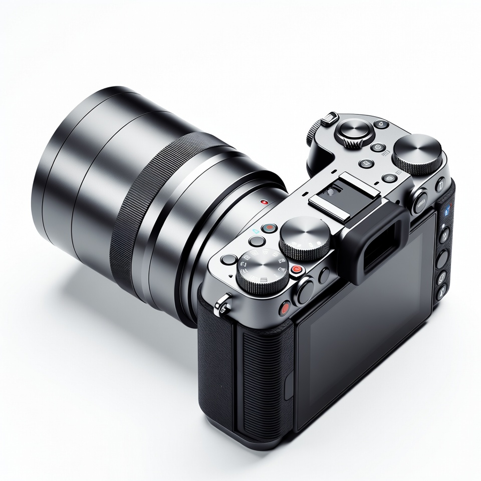 3D render, LCD screen, camera body, camera buttons, camera lens, control dials, digital camera, isolated background, mirrorless camera, photography equipment, professional camera, silver camera, telephoto lens, white background, camera