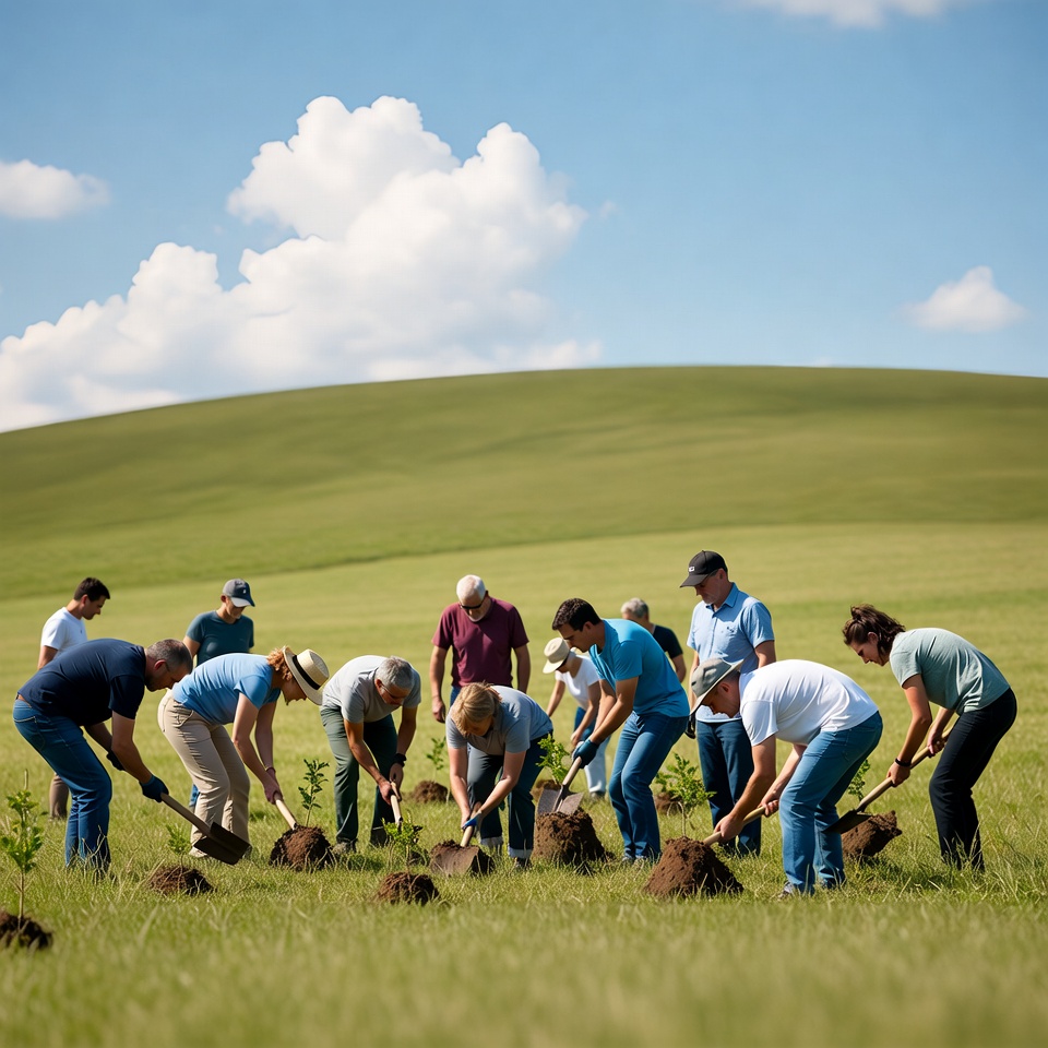 A diverse group of men and women plants young trees in a lush green field under a blue sky with white clouds. They use shovels to dig holes and position saplings on a grassy hillside. Participants wear casual outdoor clothing including hats and t-shirts.