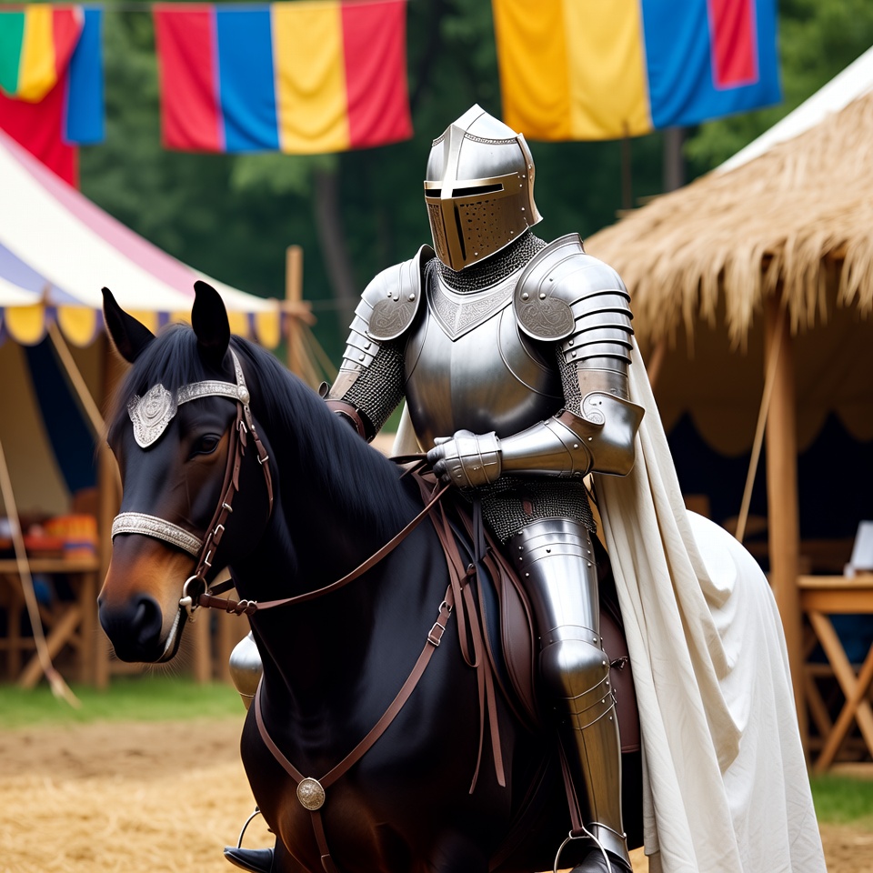 armor, black horse, bridle, cape, colorful flags, field, flags, helmet, horse, knight helmet, medieval knight, medieval tents, outdoor, reins, renaissance fair, riding horse, saddle, silver armor, tents, white cape, knight