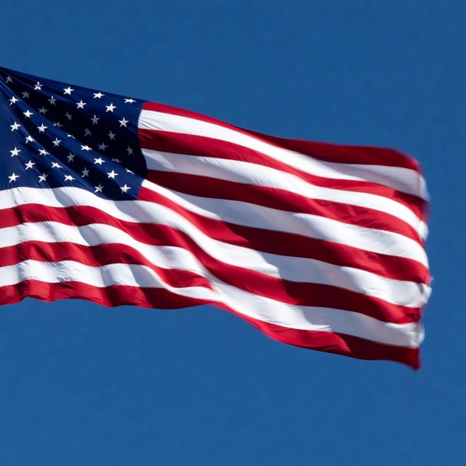 American Flag Waving Against Blue Sky