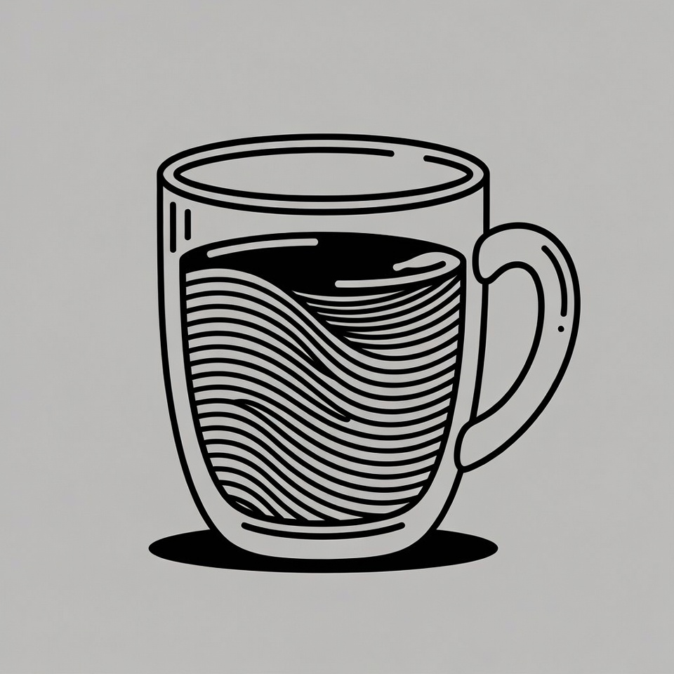A minimalist black line drawing of a clear glass mug filled with steaming coffee. The mug features a handle and wavy lines representing steam rising from the dark liquid surface. It is isolated on a light gray background with a subtle drop shadow.
