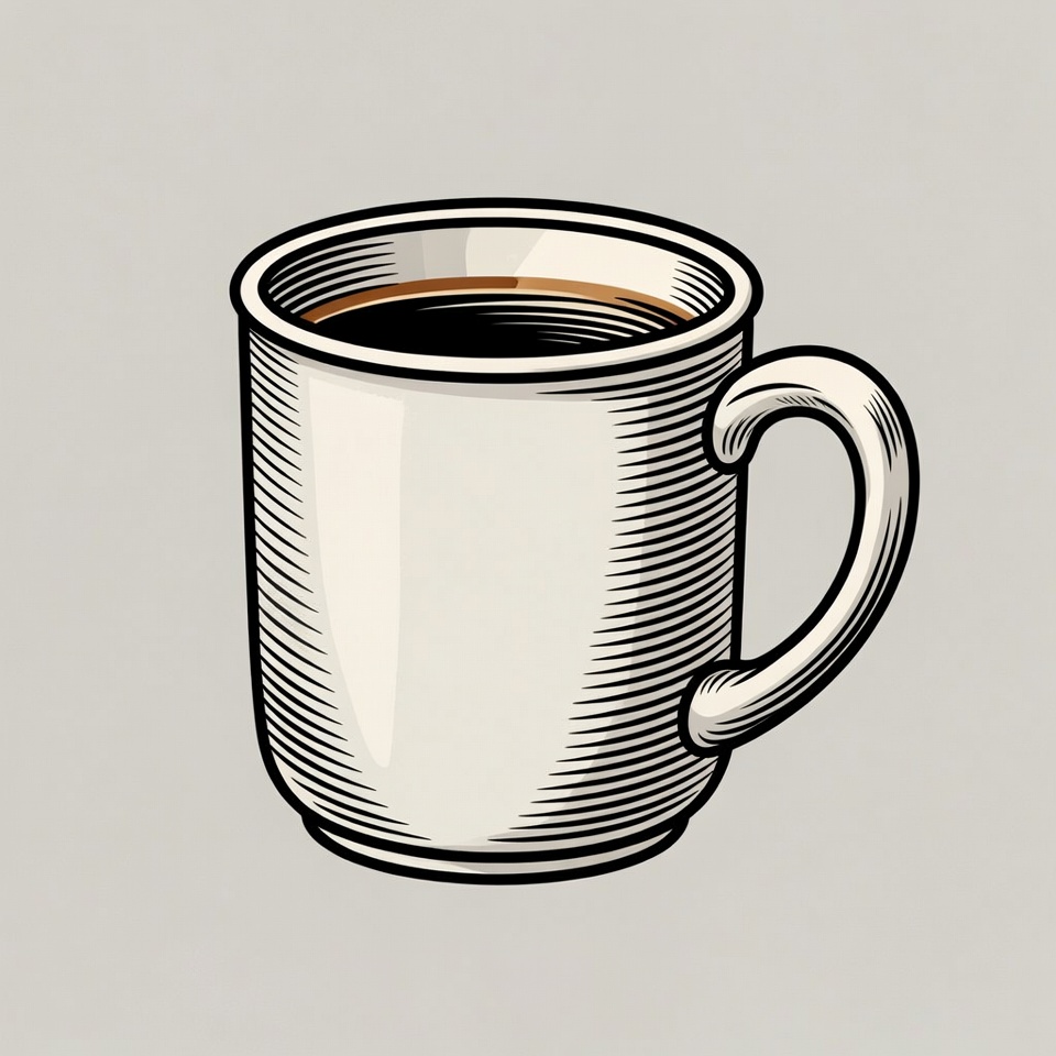 A hand-drawn illustration of a white ceramic mug filled with dark coffee. The mug features a curved handle and textured line art shading on a plain gray background. Steam is not visible, and the coffee surface shows a slight sheen.