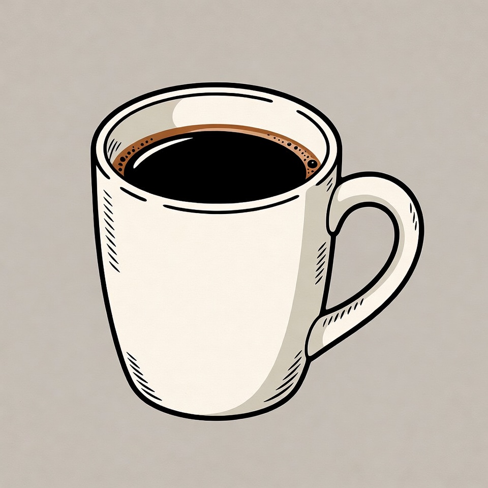 A hand-drawn illustration of a white ceramic mug filled with steaming black coffee. The mug features a simple handle and subtle shading for depth. It is isolated on a light gray background.