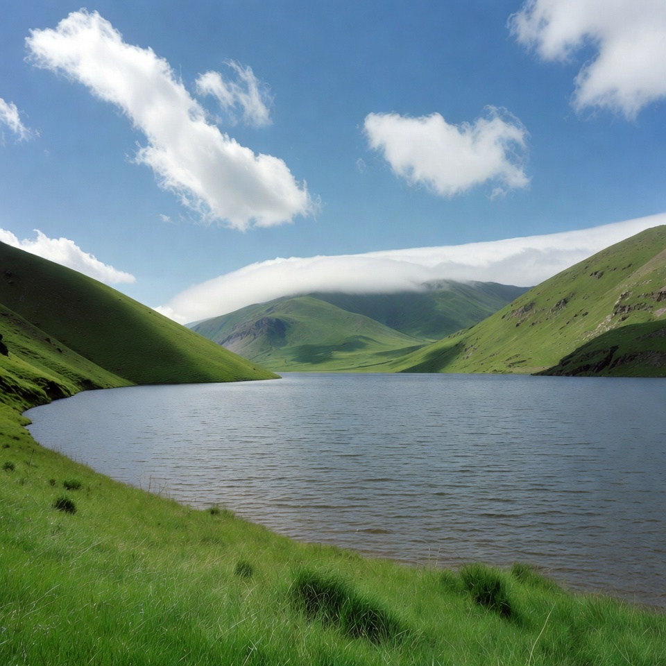 A calm lake sits nestled between lush green rolling hills and mountains under a bright blue sky with scattered white clouds. Gentle waves ripple on the water's surface, bordered by vibrant green grass. Clouds partially drape the distant mountain peaks.