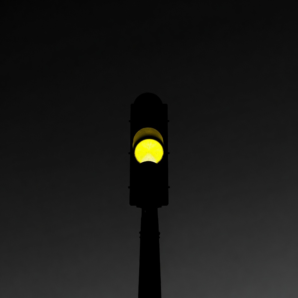 black background, caution light, illuminated light, isolated, night, pole, road sign, signal light, stoplight, street light, traffic signal, urban, warning light, yellow light, yellow signal, traffic light