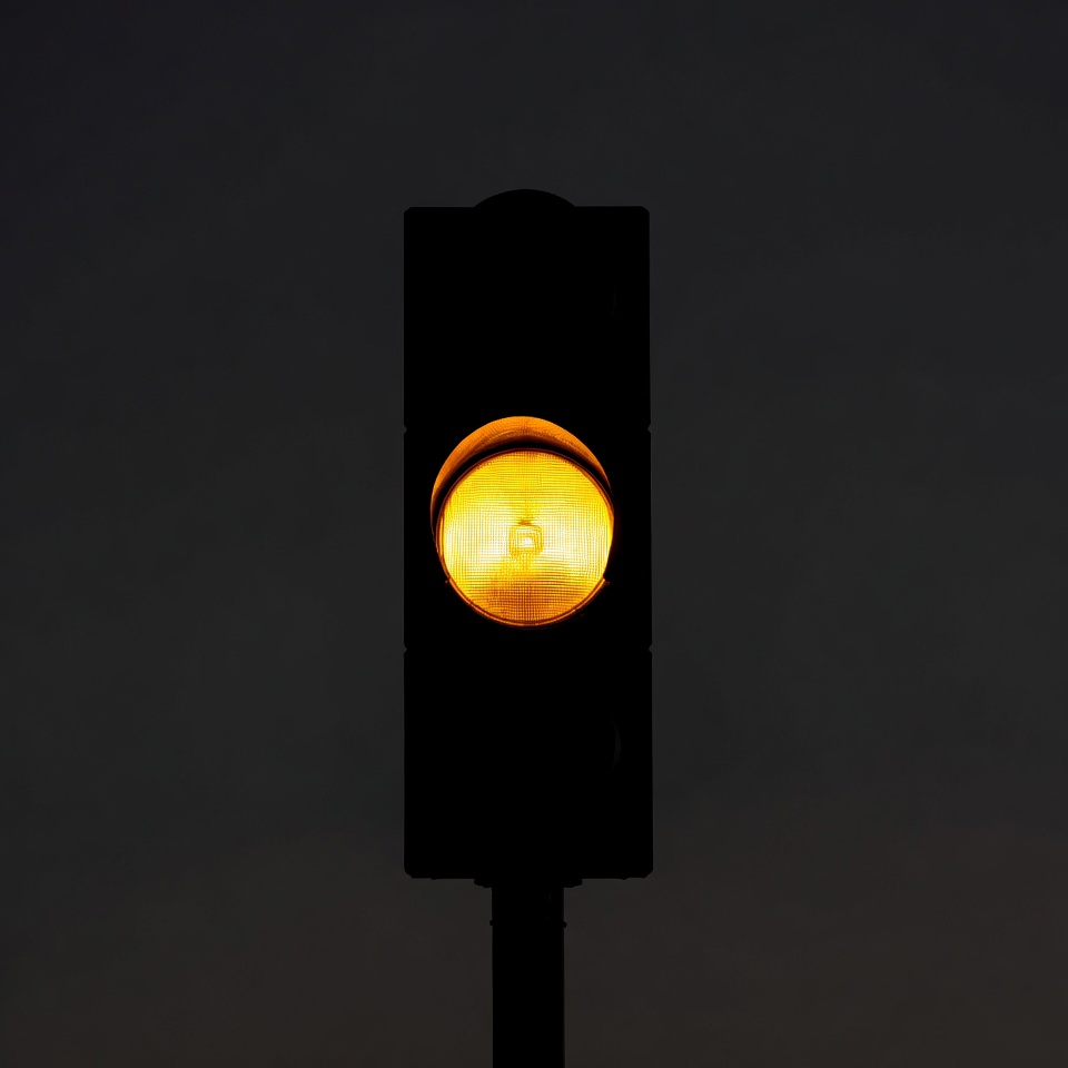 caution light, dark background, glowing light, illuminated, night, road safety, semaphore, signal light, stoplight, street sign, transportation, urban, vertical pole, yellow light, traffic light