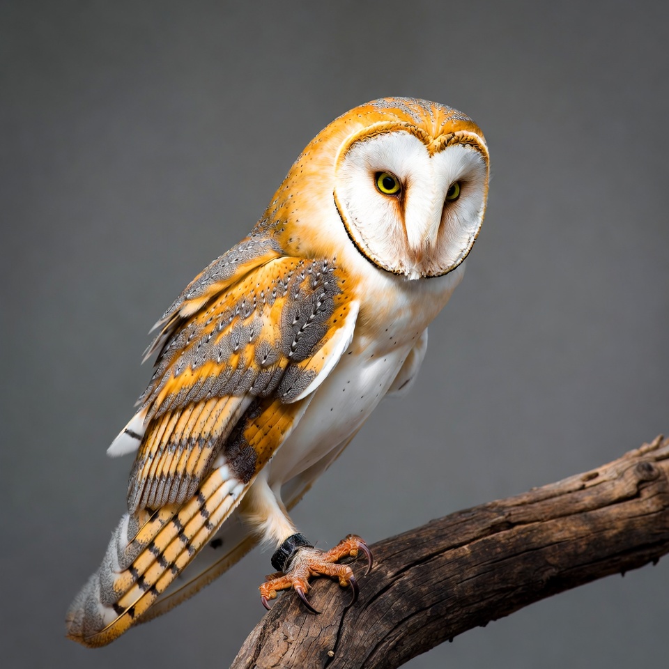 A barn owl with orange and white feathers and striking yellow eyes perches on a gnarled wooden branch. Its wings are slightly folded, and detailed feathers show gray and brown patterns. The bird faces forward against a dark gray background.