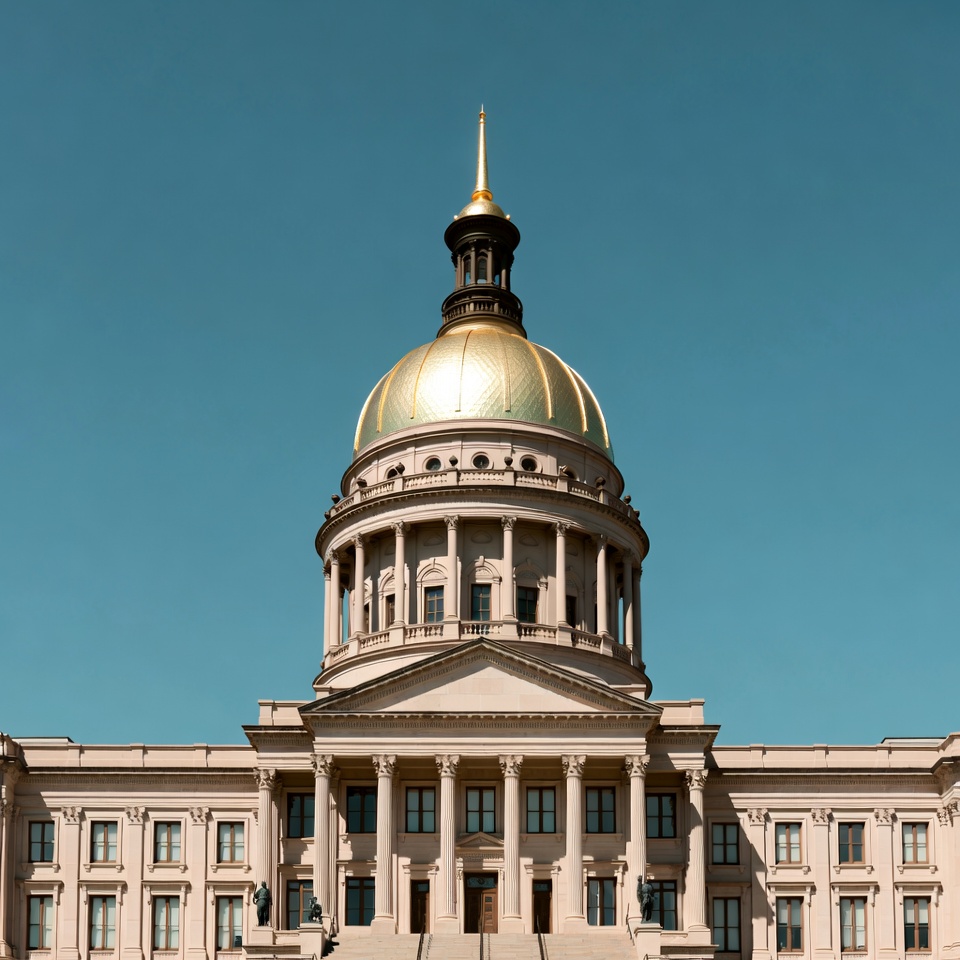 Atlanta, architecture, blue sky, capitol building, columns, dome, gold dome, golden dome, government building, historic building, isolated background, landmark, neoclassical, spire, state capitol, Georgia capitol