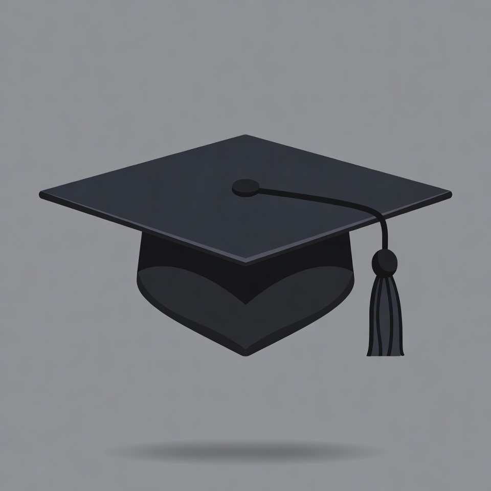 A black graduation cap with a heart-shaped mortarboard sits on a gray background. The cap features a tassel hanging from the top corner. It is a simple vector illustration with a subtle shadow.