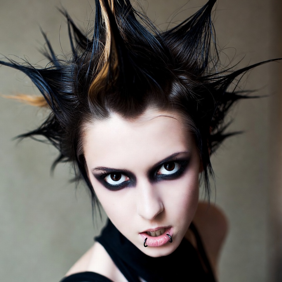 White, black hair, black top, blonde highlights, dark makeup, edgy look, emo, eyeliner, female, goth, hairstyle, heavy makeup, intense stare, lip piercing, mohawk, piercing, portrait, punk, spiked hair, young woman, woman