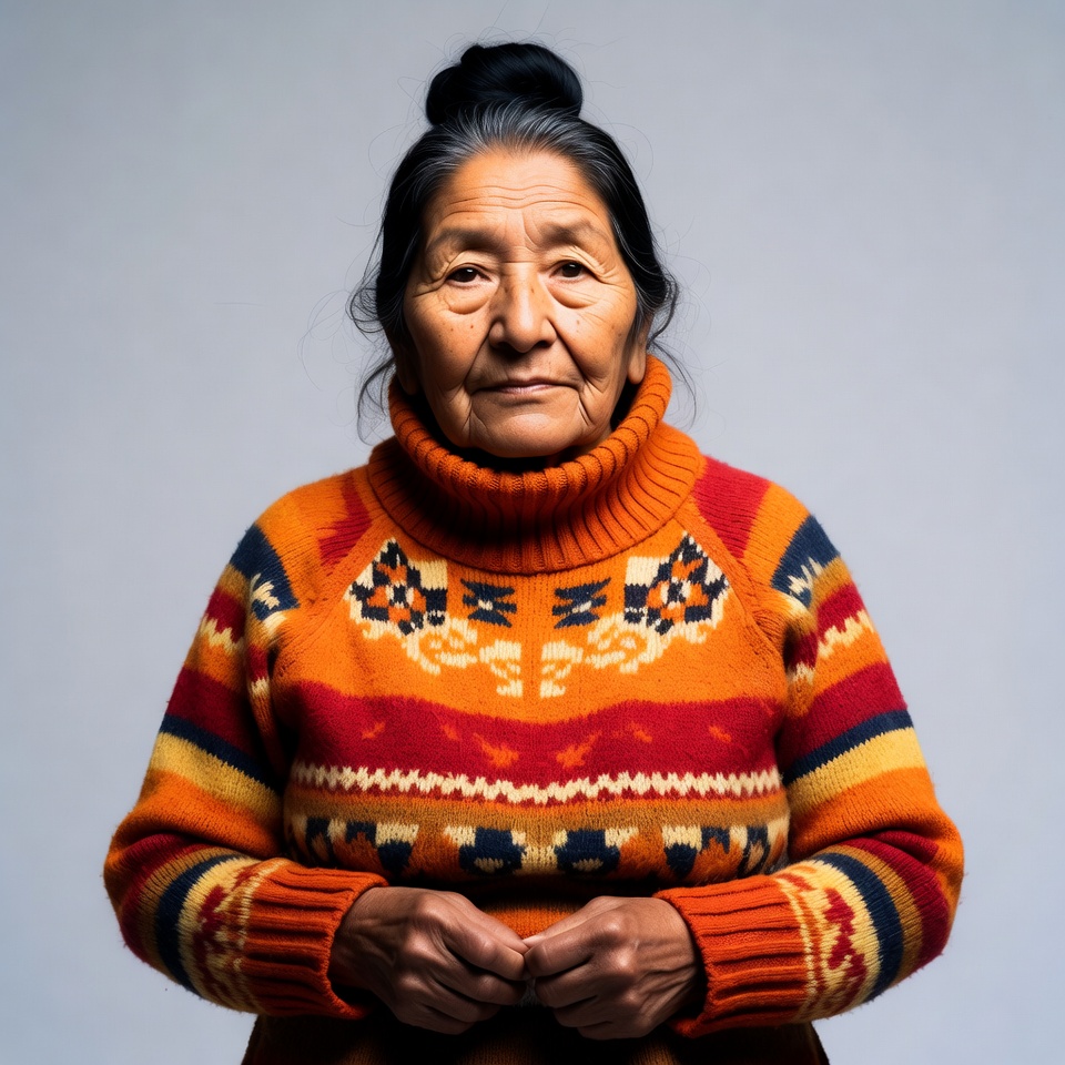 Elderly Indigenous woman in colorful sweater