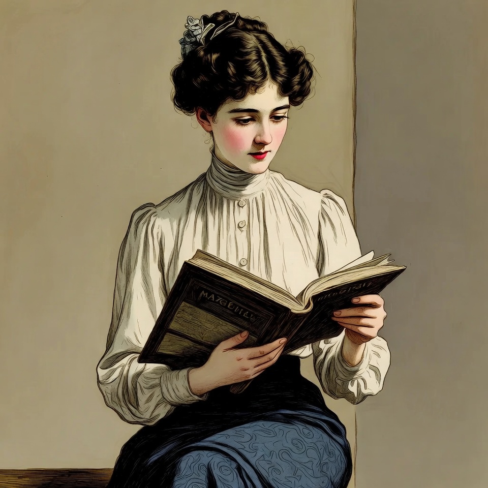 Edwardian fashion, Victorian, White, beige background, blue skirt, detailed painting, elegant, female, flower hair accessory, high collar, historical clothing, illustration, indoor, open book, portrait, puffed sleeves, reading book, sitting, updo hairstyle, white blouse, young woman, woman