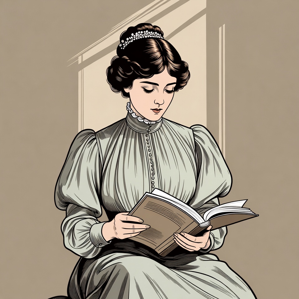 An illustrated Edwardian woman with dark hair in an updo and pearl tiara sits wearing a high-collared, puff-sleeved gray dress. She holds an open brown book in her hands, reading attentively. The scene features a beige background with soft window light.