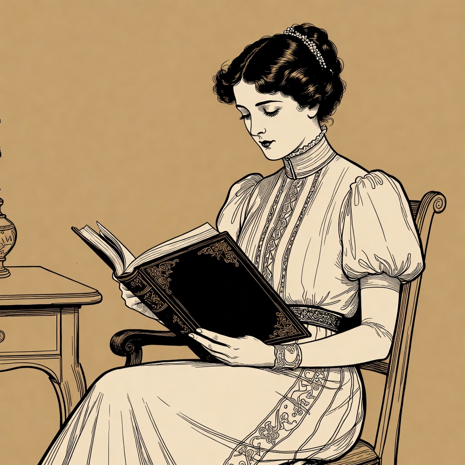 A woman in an Edwardian high-necked blouse and long skirt with puffed sleeves sits in a wooden chair reading an open book with ornate covers. She has dark curly hair styled up with a decorative comb and is positioned at a small wooden table beside a decorative lamp. The scene is rendered in a detailed line art illustration style on a beige background.