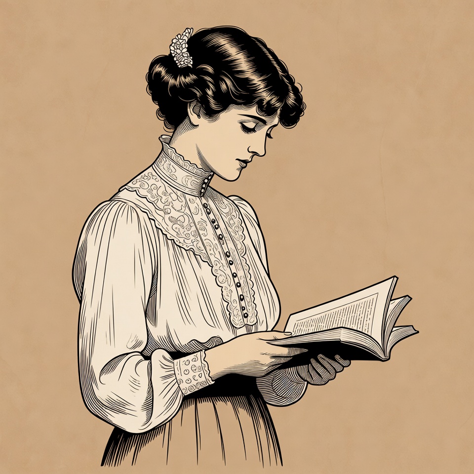 A young woman with dark hair styled in an updo wears a white lace-trimmed blouse and skirt in this line art illustration. She stands in profile, holding an open book with both hands and gazing down at the pages. The beige background highlights her Edwardian-era attire and focused pose.