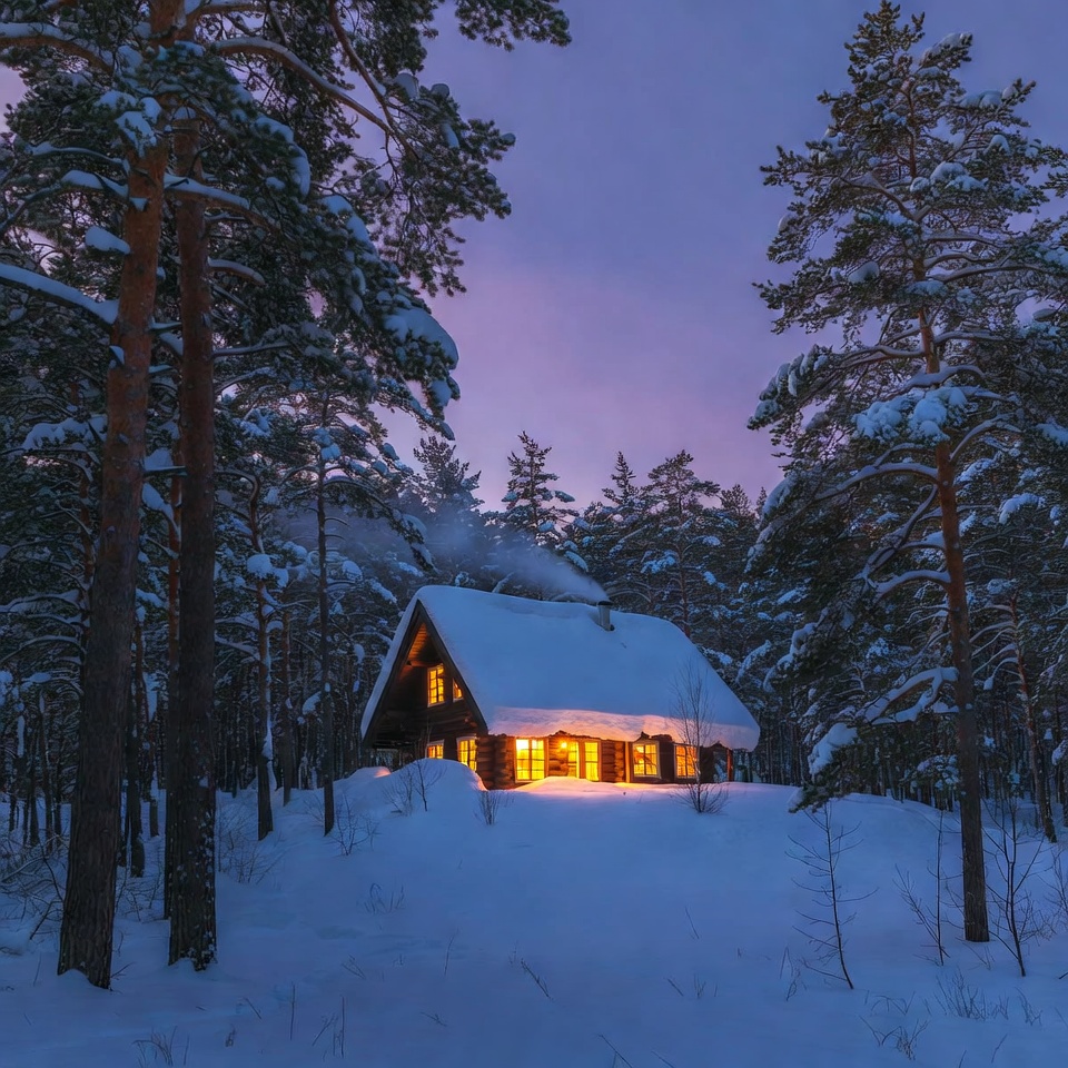 Snowy Cabin in Pine Forest at Twilight