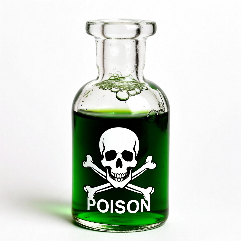 A clear glass bottle filled with bubbling green liquid stands against a white background. A black skull and crossbones symbol is prominently displayed on the front, along with the bold word 'POISON'. The toxic warning label is clearly visible on the container.