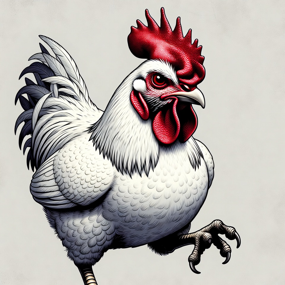 A detailed illustration of a white rooster with a bright red comb and wattle stands on a plain background. The rooster has an aggressive expression with glaring red eyes and an open beak. Its feathers are white with black accents, and its talons are sharply detailed.