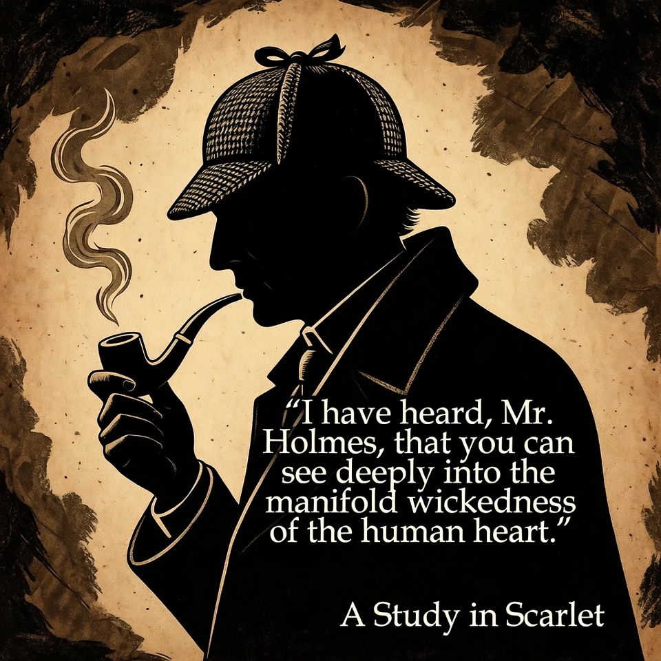 A silhouette illustration of Sherlock Holmes wearing a deerstalker hat and inverness cape, smoking a curved pipe with smoke rising. He stands against a textured sepia background. The quote 'I have heard, Mr. Holmes, that you can see deeply into the manifold wickedness of the human heart' from A Study in Scarlet appears below.
