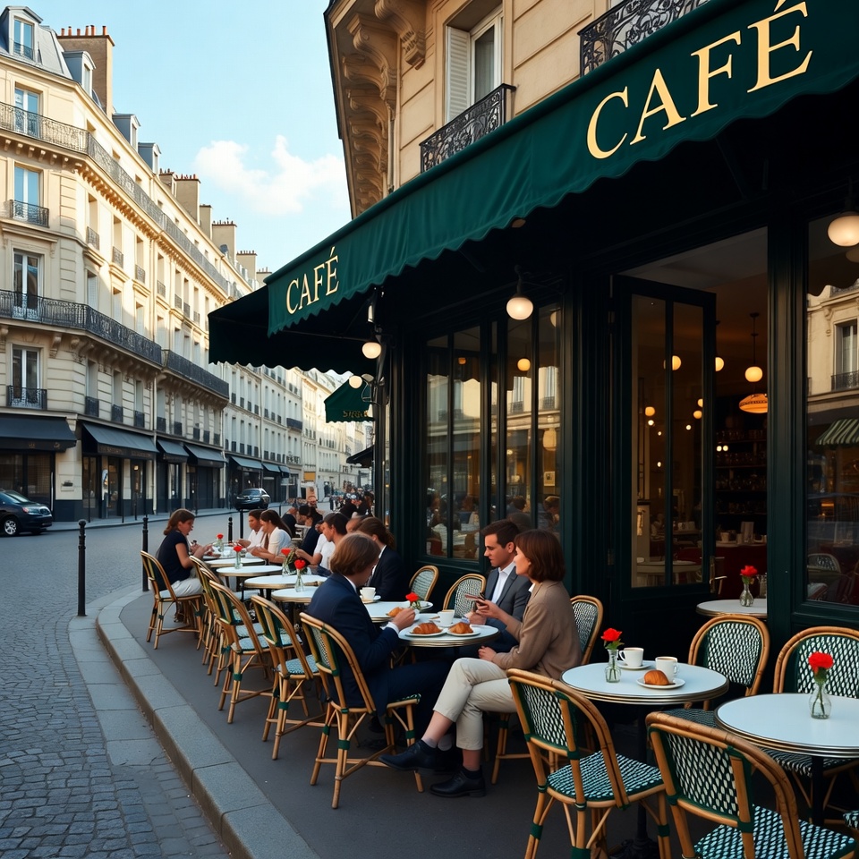 European architecture, French bistro, French cafe, Haussmann buildings, Parisian street, beverages, bistro tables, cafe chairs, cafe sign, cafe terrace, city sidewalk, cobblestone street, coffee cups, corner cafe, croissants, dining patrons, elegant facade, green awning, outdoor seating, pastries, round tables, seated people, street dining, street scene, sunny day, urban cafe, white chairs, Paris cafe