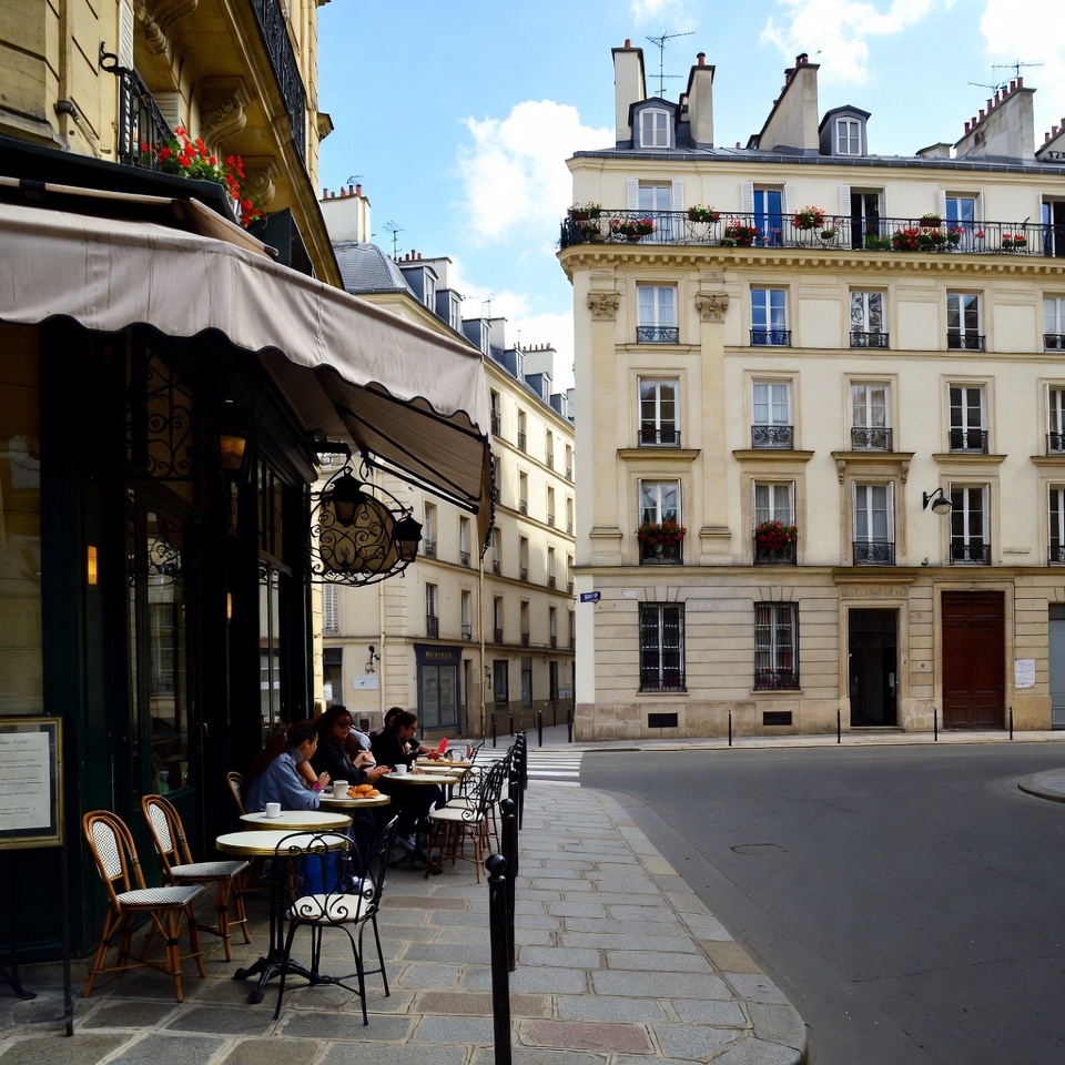 European architecture, French bistro, Haussmann buildings, Paris street, beige facade, blue shutters, cafe awning, cafe chairs, cafe tables, coffee cups, crosswalk, flower boxes, men, outdoor terrace, pedestrians, people, plates, red flowers, round tables, sidewalk seating, street corner, sunny day, urban scene, women, Paris cafe