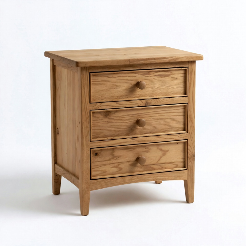 bedroom furniture, bedside table, end table, home decor, isolated background, oak wood, round knobs, rustic nightstand, small table, solid wood, tapered legs, three drawers, wood grain, wooden furniture, nightstand