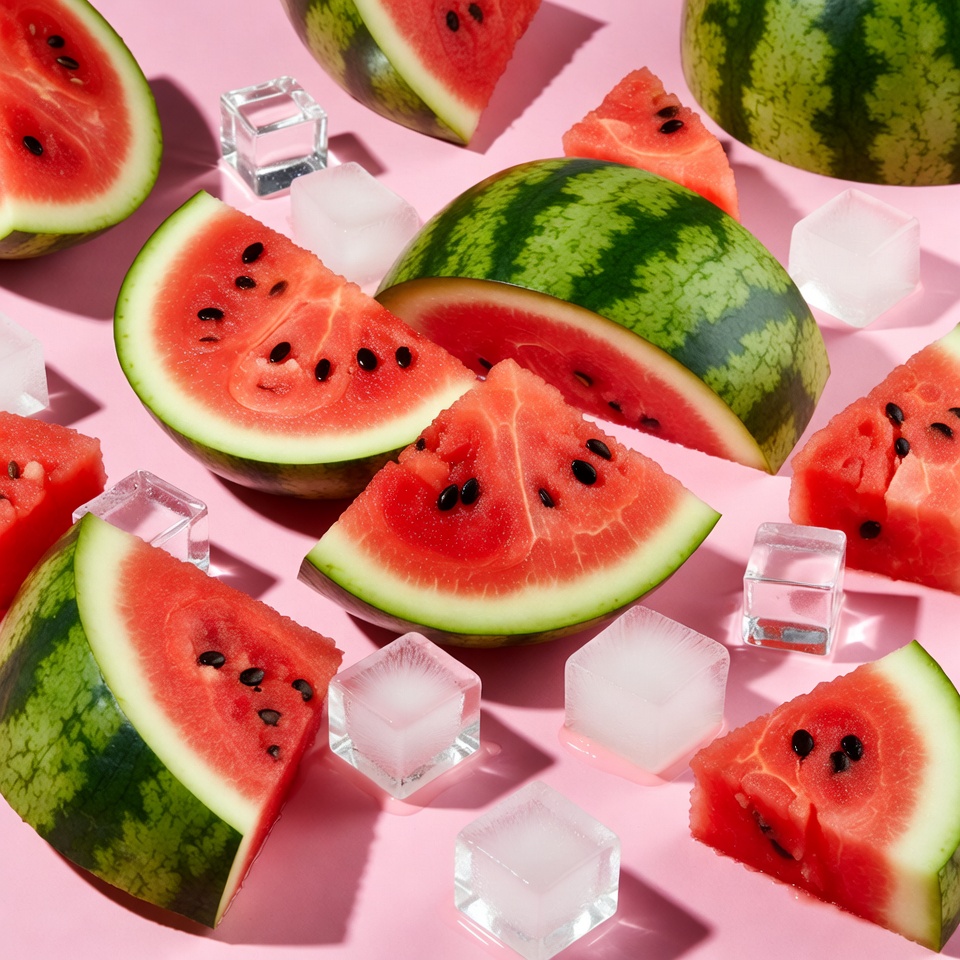 Fresh watermelon slices with vibrant red flesh and black seeds are arranged on a pink background. Ice cubes are scattered among the juicy wedges, adding a cool contrast. Shadows enhance the realistic texture of the fruit and ice.
