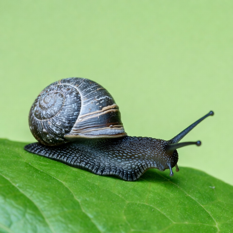 antennae, black snail, brown snail, closeup, crawling, garden snail, green leaf, isolated background, macro, mollusk, nature, outdoor, shell, slimy, spiral shell, texture, wildlife, snail