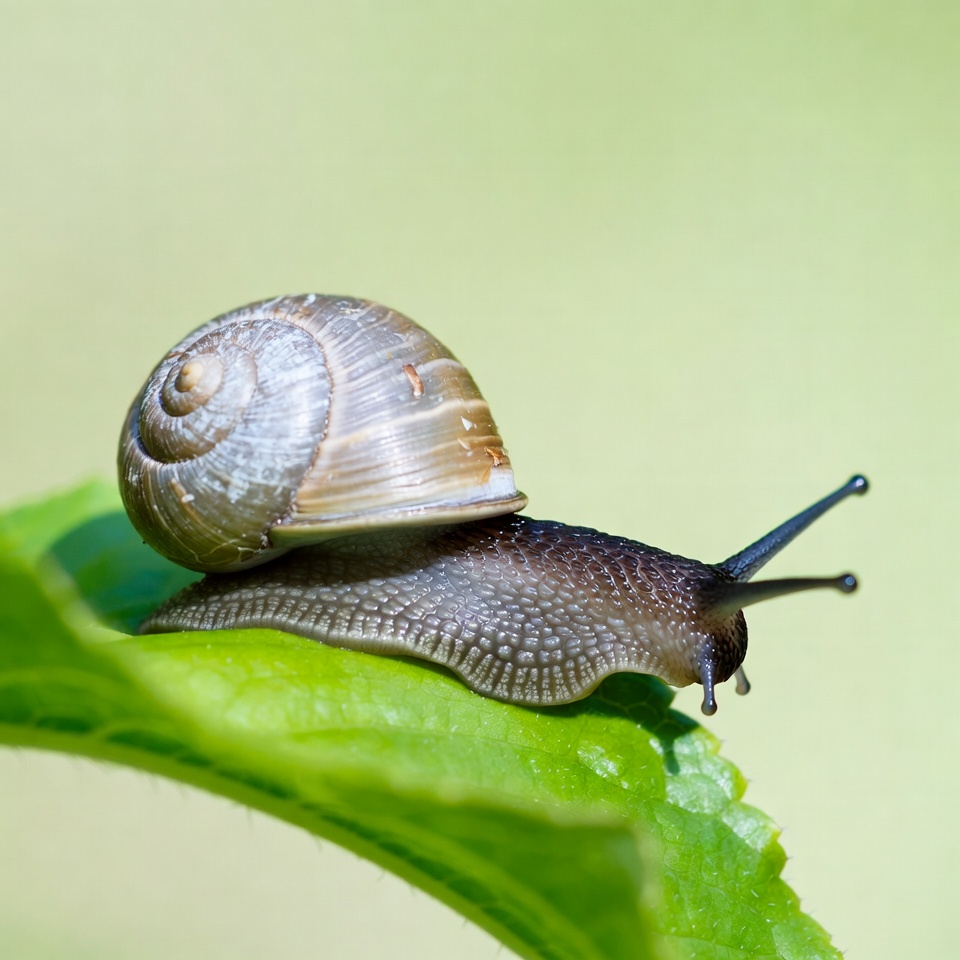 animal, antennae, brown snail, closeup, crawling snail, garden snail, green background, green leaf, invertebrate, leaf, macro, mollusk, nature, outdoor, shell, slimy, snail shell, spiral shell, wildlife, snail