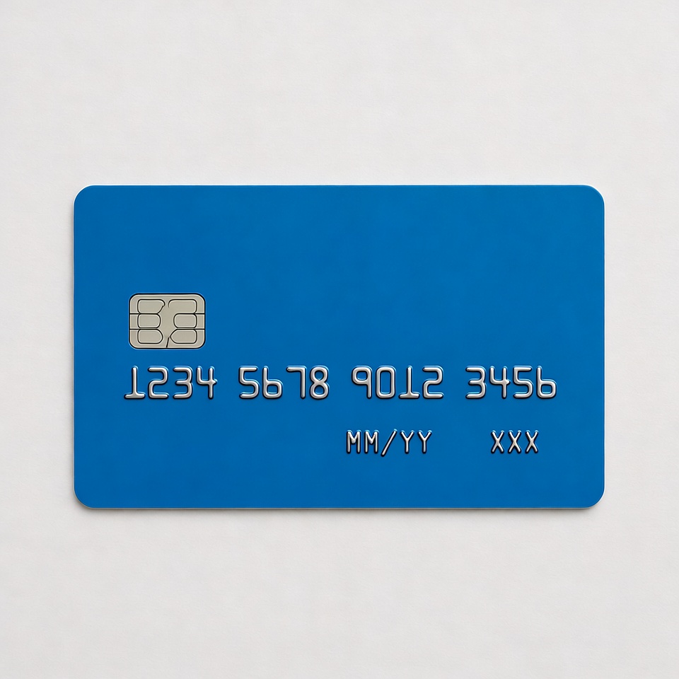 A blue credit card with a chip is shown against a white background. The card features the number 1234 5678 9012 3456 and an expiration date of MM/YY XXXX. It has a sleek, realistic 3D appearance.
