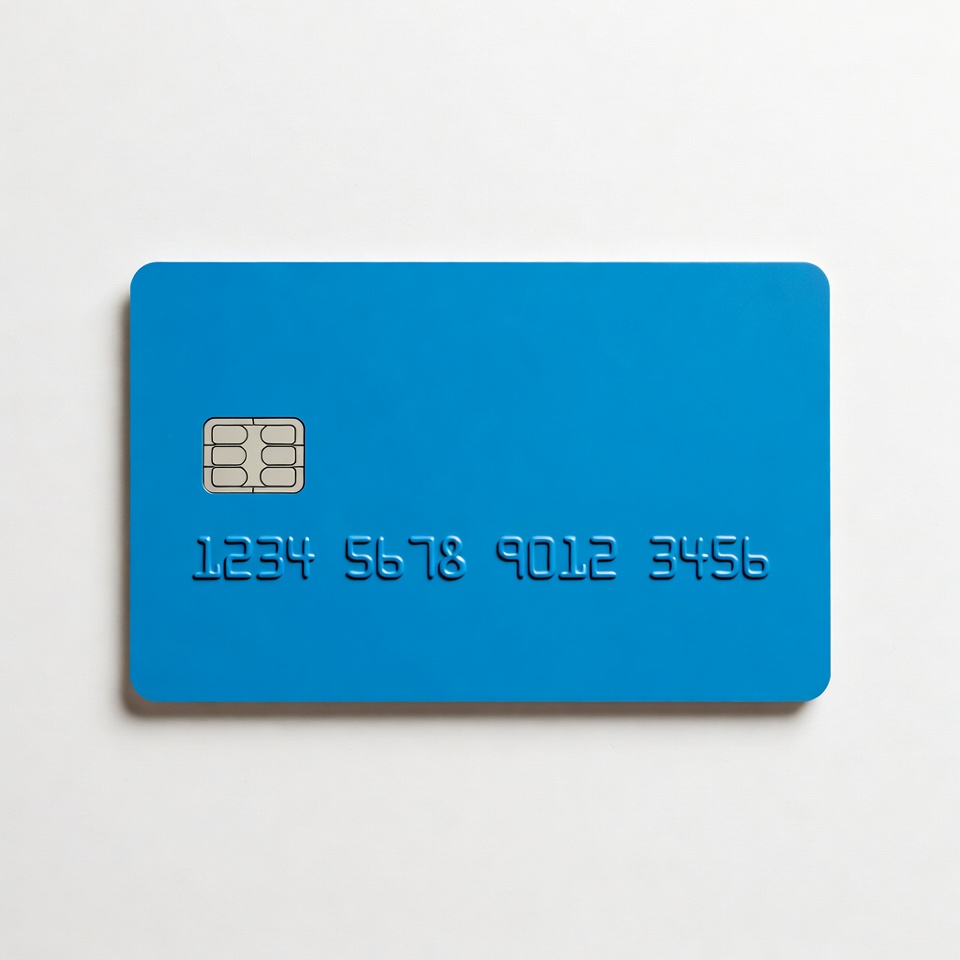 A blue credit card with a chip and embossed number 1234 5678 9012 3456 lies flat on a white background. The card has rounded corners and a glossy finish. It is centered and isolated with ample white space around it.