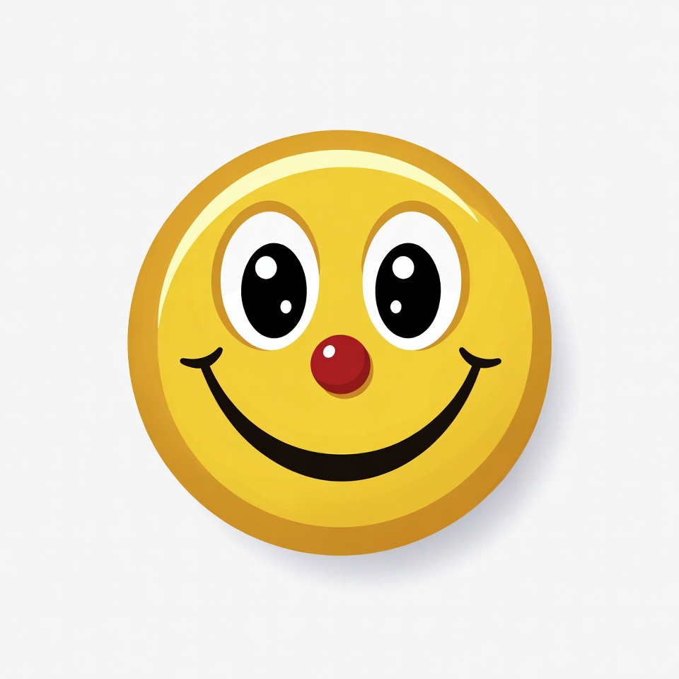 3D effect, big eyes, cartoon emoji, clipart, clown face, glossy, happy face, illustration, isolated background, red nose, smiling clown, wide smile, yellow face, clown emoji