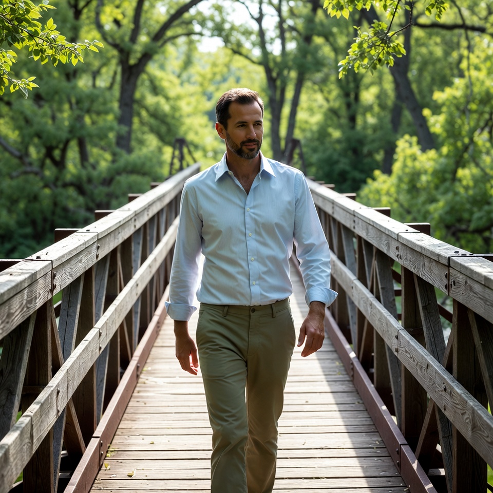 White, adult man, beard, bridge railing, casual attire, footbridge, forest, green trees, khaki pants, light blue shirt, lush greenery, male, nature, outdoors, park bridge, path, short hair, sunlight, trail, trees, walking, wooden bridge, woodland, man