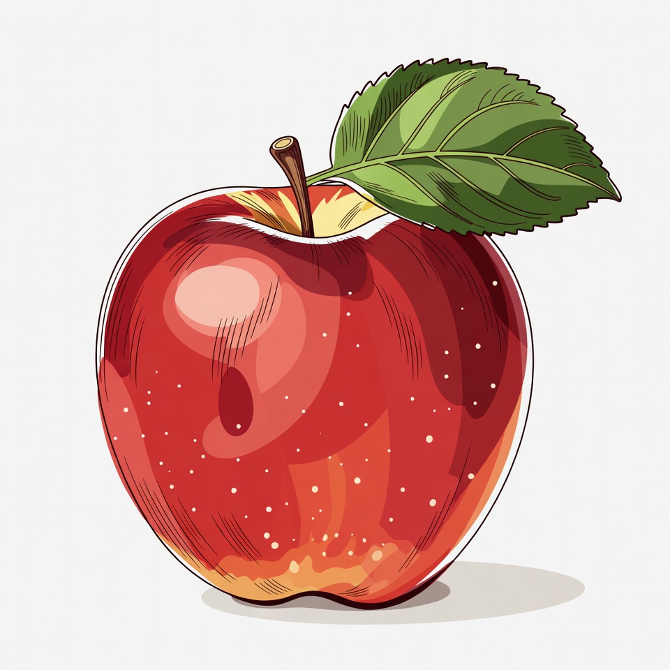 apple, clipart, drawing, fresh fruit, fruit, glossy apple, green leaf, illustration, isolated background, leaf veins, ripe apple, shiny fruit, stem, vector art, red apple