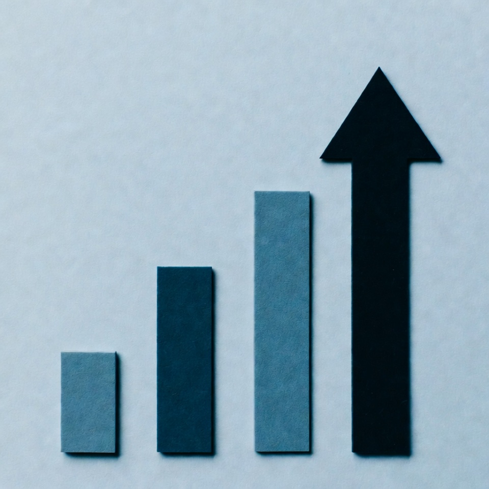 A series of four paper-cutout bars in shades of gray and blue rise progressively on a light blue background. A large black upward arrow points to the tallest bar, symbolizing growth. The elements are arranged flat against the solid background.