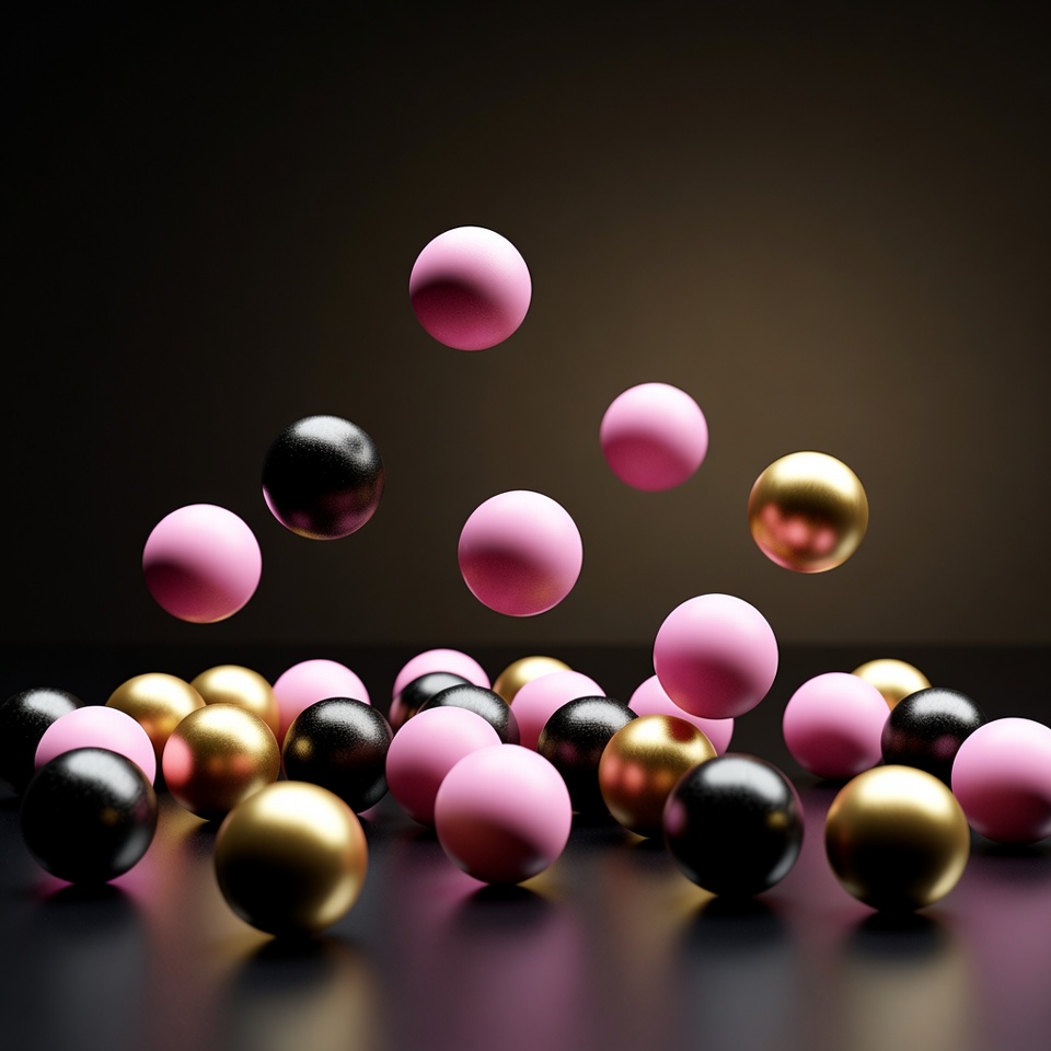 A cluster of glossy spheres in pink, black, and gold colors floats against a dark gradient background. Several balls hover above others scattered on a dark surface. The metallic and smooth textures create a dynamic 3D effect.