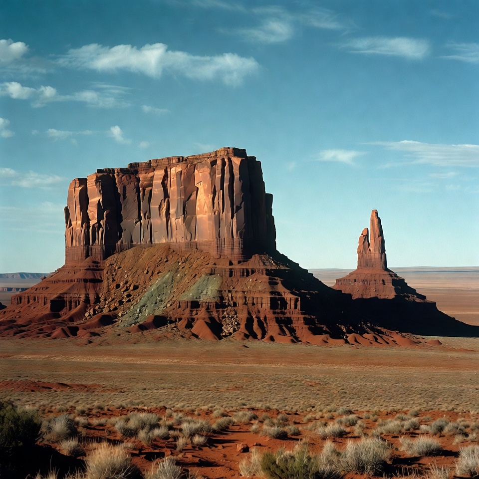 Towering red sandstone buttes rise dramatically from the desert floor in Monument Valley under a clear blue sky with scattered clouds. The main mittens formation features steep layered cliffs and a smaller spire nearby. Sparse desert vegetation and sandy terrain surround the iconic rock formations.