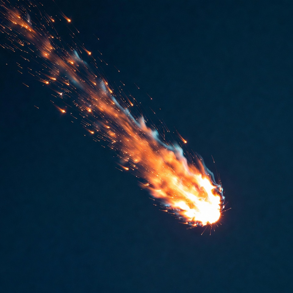 astronomy, celestial event, comet, dark background, fiery trail, fire trail, fireball, flames, night sky, orange glow, shooting star, space, sparks, streaking meteor, meteor