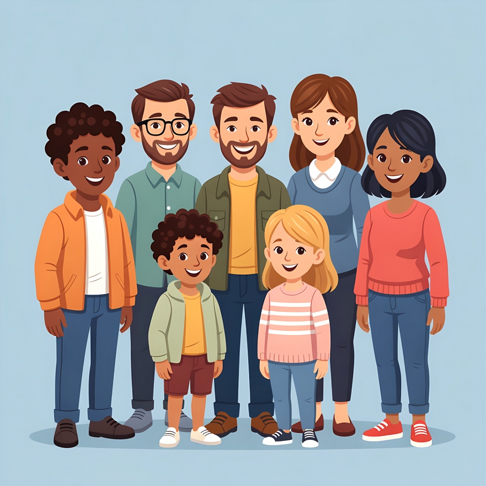 African-American, White, blue background, boys, casual clothes, cheerful, clipart, diverse family, girl, group, happy family, illustration, jackets, jeans, men, multiracial, portrait, smiling, sneakers, standing, sweaters, women, family