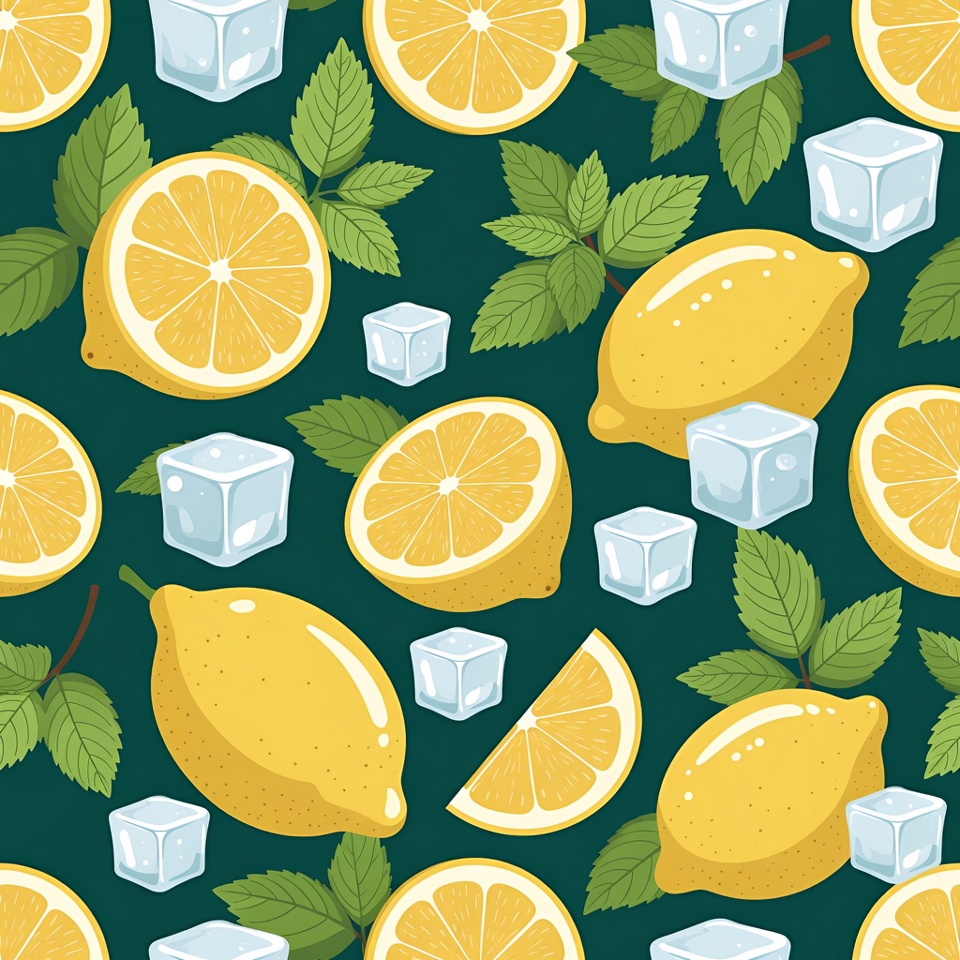 beverage theme, citrus, clipart, dark green background, food illustration, fresh fruit, graphic design, ice cubes, illustration, lemon slices, lemons, mint, mint leaves, pattern, refreshing, seamless pattern, summer pattern, vector art, yellow lemon, lemon