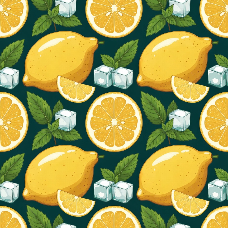 A vibrant seamless pattern features whole yellow lemons, sliced lemons, fresh mint leaves, and ice cubes. The elements are arranged on a dark green background in a repeating design. Bright colors and detailed illustrations create a refreshing summer theme.