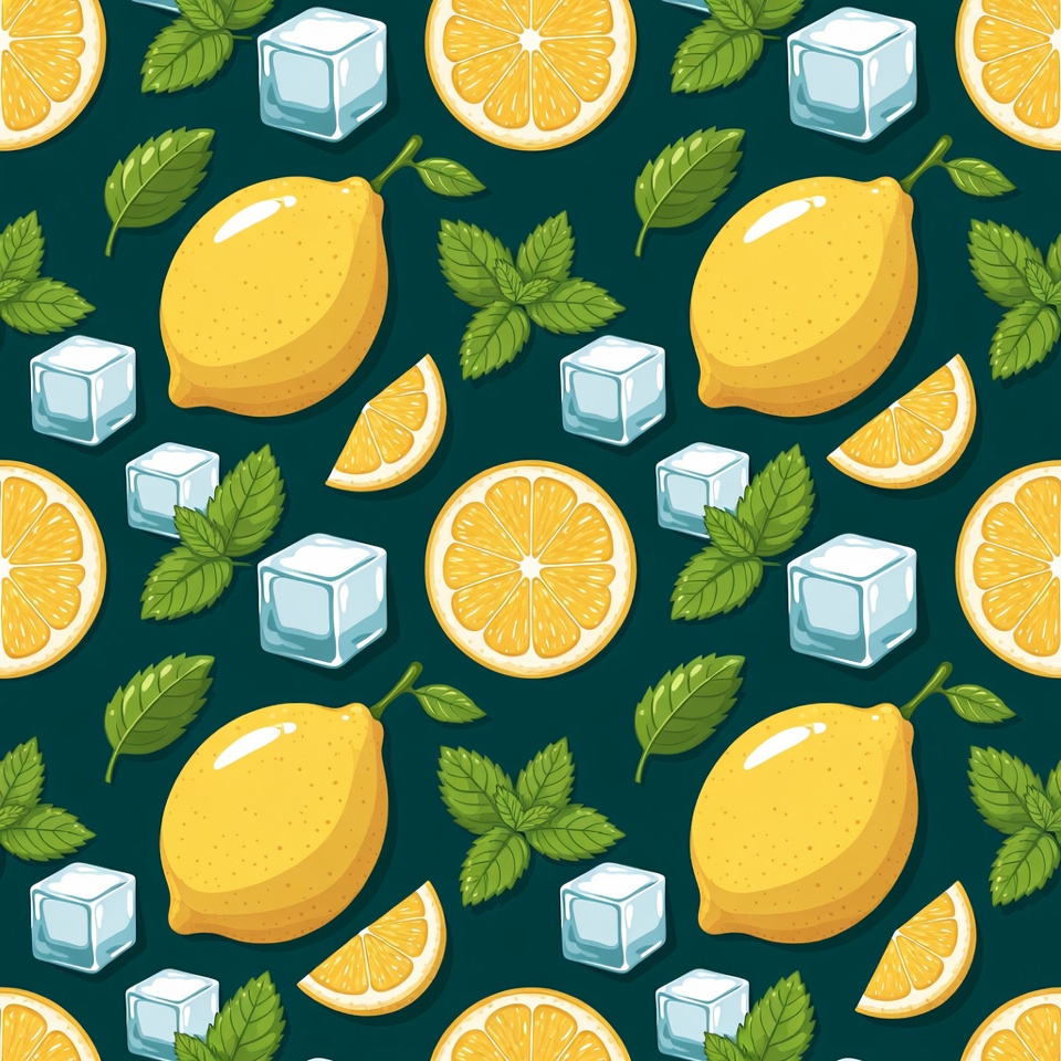 citrus, clipart, fresh mint, fruit pattern, graphic, green leaves, ice, ice cubes, isolated background, lemon slices, lemons, mint leaves, pattern design, refreshing, seamless pattern, summer drink, teal background, vector illustration, yellow lemons, lemon