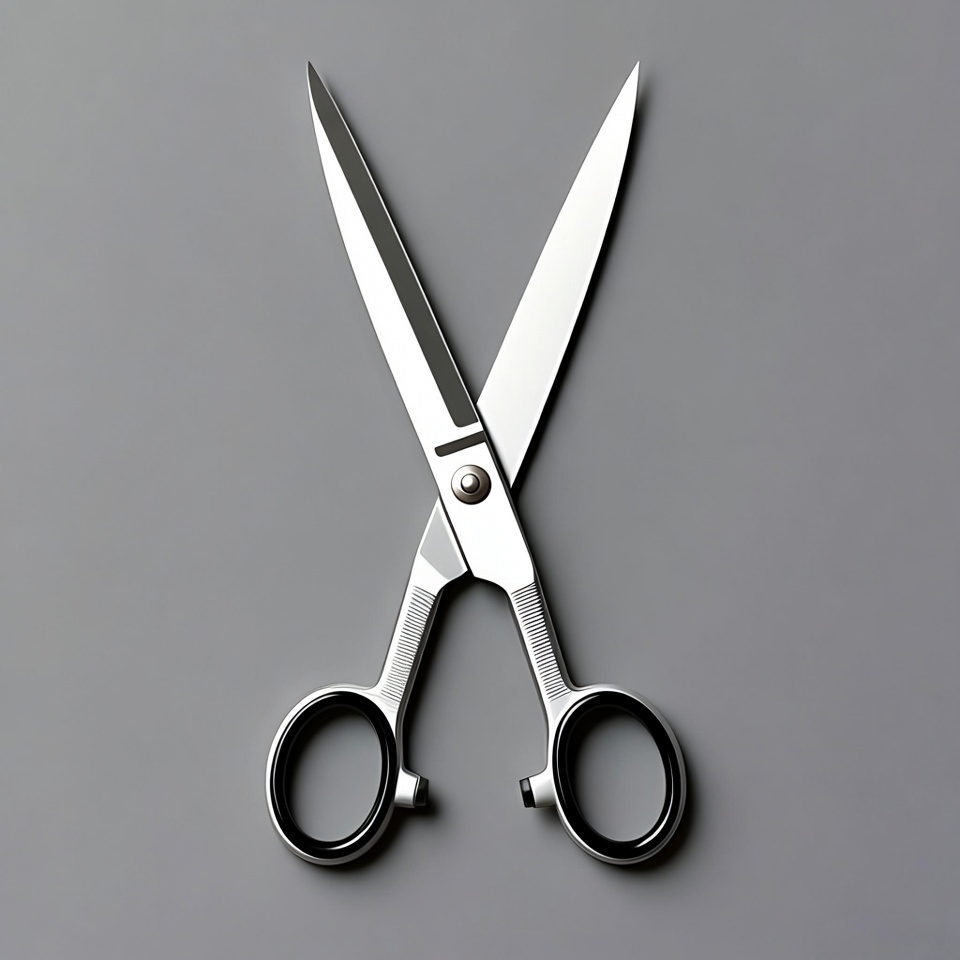 A pair of sharp silver scissors with black handles lies open on a smooth gray background. The blades are crossed and gleaming, highlighting their metallic finish and precise edges. The handles feature ergonomic grips with circular openings.