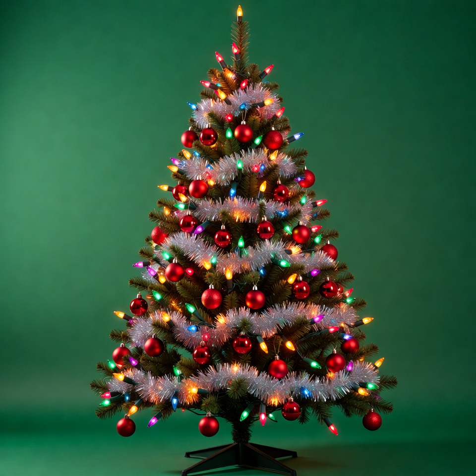 A fully decorated Christmas tree stands on a green background with multicolored lights twinkling along its branches. Red, green, and gold ornaments hang from the artificial pine needles, accented by white tinsel garlands. The tree is mounted on a black stand at the base.