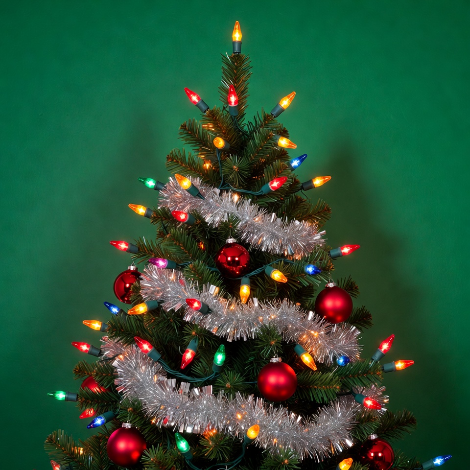 A decorated artificial Christmas tree stands against a solid green background. It is adorned with multicolored string lights, silver tinsel garland wrapped around the branches, and red glass ornaments. The tree has a classic conical shape with a pointed top.